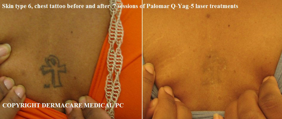 Laser treatment is the only effective method of tattoo removal that is unlikely to cause skin scarring. The alternatives to laser tattoo removal include surgical excision, salabrasion (using salt to burn away layers of skin), and chemical peels (using acid to burn away layers of skin). These methods not only cause scars but are also very painful. Laser treatment with the Palomar Q-YAG 5 is a state –of-the art treatment that yields excellent results without the perils and disadvantages of other procedures.